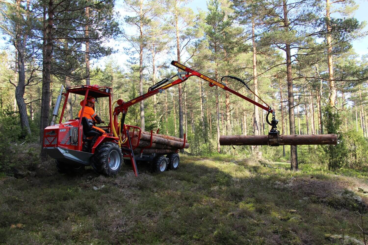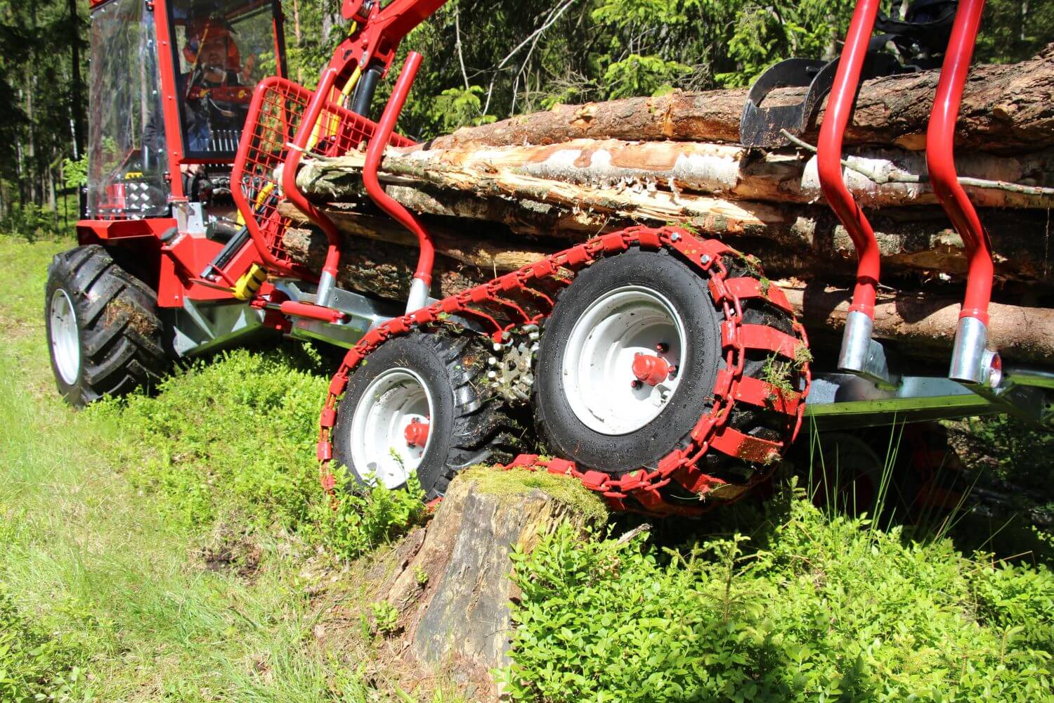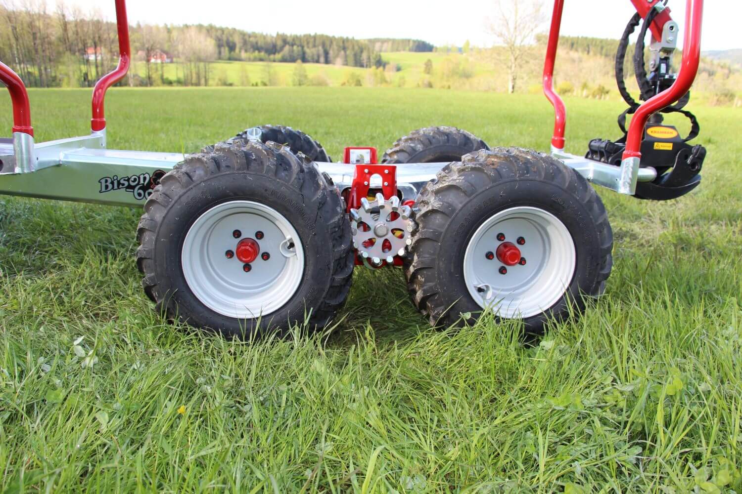 The Bison 6000 is very easy to drive and agile. The machine is hydraulically driven. This means that the machine has stepless travel pedals that regulate the speed. If you release the pedal, the machine stops and it stands still until you press the pedal again. There are two pedals for the direction of travel, one for forward and one for reverse. With a Bison 6000, you do a very efficient job. You can sit backwards and drive the machine on one turn, release the drive pedal, load the log and press the pedal again and you’re off. All without having to let the machine idle, shift in and out of gear or apply the handbrake. The Bison 6000 is agile because it means that the trolley on the machine makes a minimal noise when fully handlebard. Despite its narrow width of only 135 cm, the Bison 6000 is very stable. This is thanks to its low center of gravity. The Bison 6000 has high and low gear (7 and 3.5 km/h respectively) The low gear and high gear have 6-wheel drive. The low and high gear have a 6-wheel drive. Transport gear is optional, the machine will then run on 14 km / h.