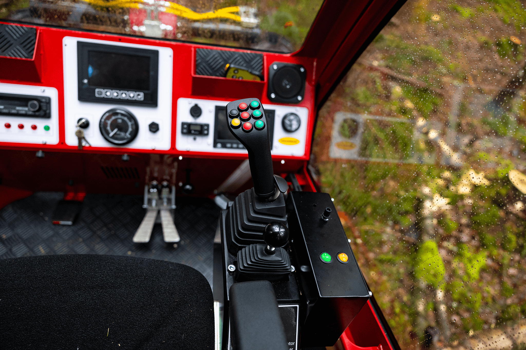 In the spacious engine compartment sits a powerful four-cylinder Kubota 1.5-litre diesel with 94 Nm of torque and low fuel consumption – an average of 3.5 litres per hour. The large 68-litre fuel tank provides up to 20 hours of runtime.The power of the engine allows for several completely separate pumps: hydrostatic pumps for the front and rear, gear pump for the crane/steering and a Parker 28 cc artificial pressure pump for the head. All functions can be run at the same time without losing power, which gives more trunks per hour and a very responsive driving feel in dense thinning.